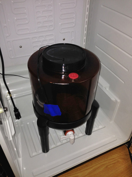 Для тестирования этого ферментера я решил приготовить Pale Ale. Перед началом работы я быстро промыл ферментер и как следует ополоснул. Подготовка прошла хорошо, и пока сусло остывало, я плеснул немного очистителя Star San в ферментер и через несколько минут слил его через кран, чтобы тот тоже был продезинфицирован. Солодовый экстракт остыл, и я залил его прямо в ферментер Brew Demon. Вышло около 8,5 литров — хороший объем. Далее я добавил сухие дрожжи Safale, и вот оно, преимущество широкой крышки: можно спокойно засыпать дрожжи внутрь прямо на сусло вместо возни с попытками попасть в горлышко бутыли. Таким образом, в сусло попадает больше дрожжей — ведь их остатки не прилипают к горлышку изнутри. Я перенес устройство в мой личный храм ферментации — маленький холодильник — и ферментер отлично там устроился. Затем я приклеил на стенку ферментера термометр и оставил дрожжи делать свое дело.