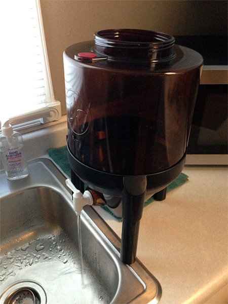 Ферментер приехал надежно упакованным и оказался очень прост в сборке: нужно только присоединить ножки к подставке и установить кран. Имейте в виду, что резиновая прокладка должна быть установлена с наружной стороны ферментера, сужающейся стороной к отверстию. Затяните гайку изнутри, но не переусердствуйте. Очень удобно, что в широкое горлышко ферментера можно легко залезть рукой и затянуть гайку безо всяких инструментов. Легкий доступ внутрь определенно пригодится и при очистке. Установив кран, я залил в ферментер воду до уровня чуть выше крана, чтобы проверить систему на подтекание. Появилось несколько капель, но эту неисправность я моментально устранил, слегка сдвинув и подтянув кран. Для этого не нужны большие усилия. Я оставил ферментер на некоторое время с водой — больше протечек не было.