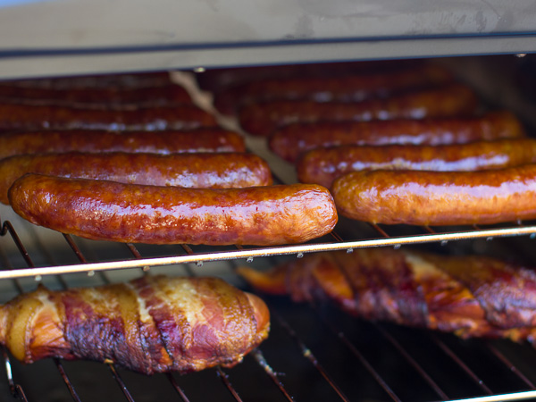 Затем я провел опыт с куриным филе и магазинными сосисками. Вышло изумительно. Единственное, что бросилось в глаза — это то, что задняя часть коптильни нагревается сильнее, так что в середине цикла я перевернул решетки, чтобы еда равномерно закоптилась и приготовилась.