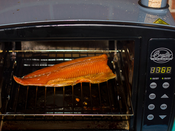 Для тестирования коптильни с рыбой я взял филе радужной форели. Обычно я беру гораздо больше, чем один кусочек филе, но в данном случае мне хотелось наглядной картины того, как коптильня справляется с рыбой. Я засолил филе по привычному рецепту, ополоснул его и отложил на часик, чтобы филе подсохло, и на его поверхности образовалась хорошая пленка. Обычно я копчу рыбу при температуре около 150F в течение первого часа, а затем увеличиваю ее на 10-20 градусов каждый следующий час. В целом, копчение занимает около 4 часов. Поскольку эта коптильня не позволяет собственноручно выставить температуру, я начал с Установки 1 и оставил ее на полтора часа. Затем я переключился на Установку 2 на оставшиеся 2,5 часа. Рыба получилась замечательной, почти не отличимой по вкусу от той, что я готовлю в четырехуровневой коптильне Bradley.