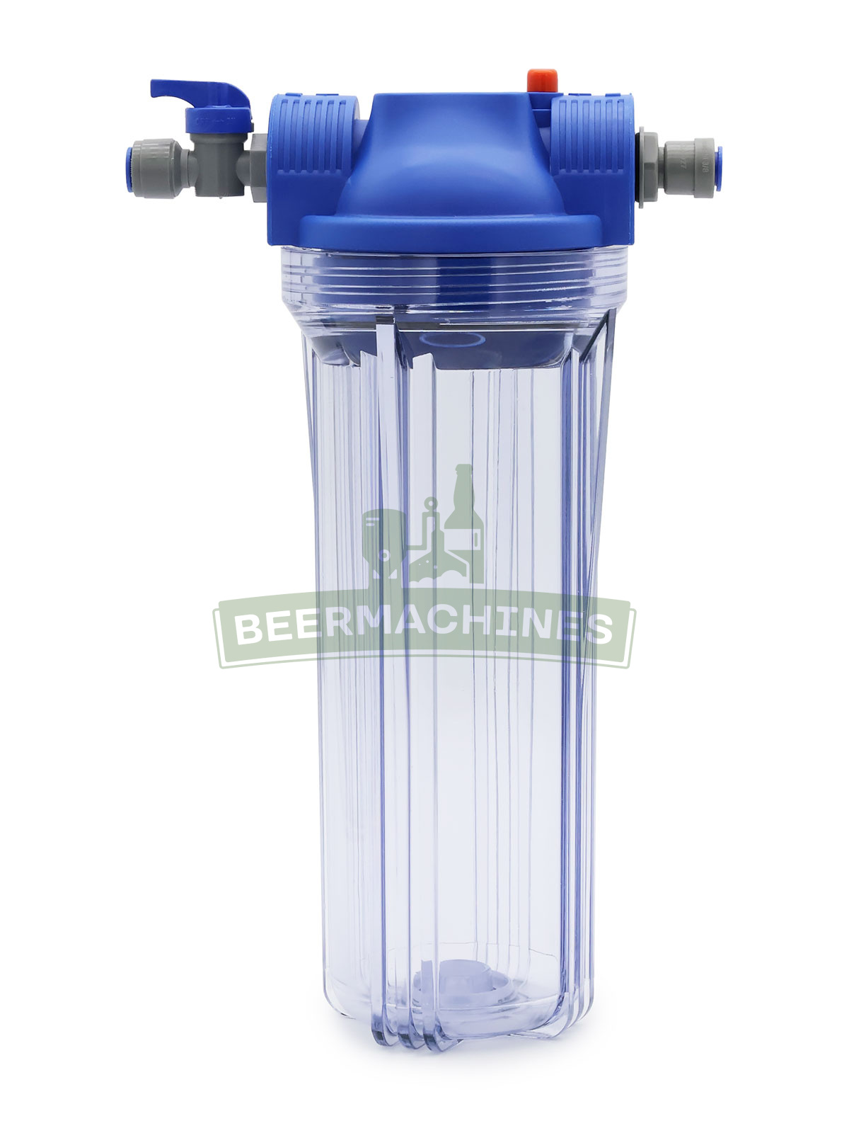 Прочный прозрачный корпус обеспечивает визуальный контроль процесса фильтрации. Крышка оснащена входом и выходом с резьбой 1/2″, а также кнопкой сброса давления. В комплект входят фитинги Duotight для подключения шлангов диаметром 9,5 мм.