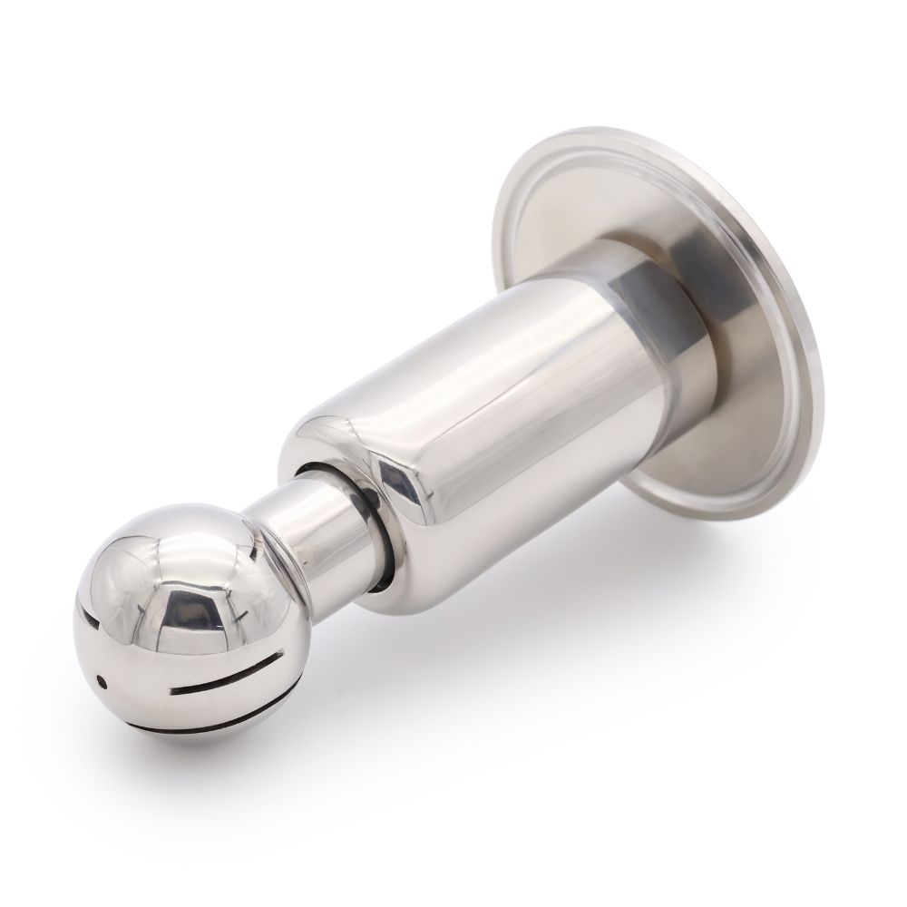 Ротационная CIP-головка распыляет жидкость во всех направлениях благодаря вращающемуся шару со специальными прорезями Устройство такой конструкции омывает внутреннюю поверхность ёмкости равномерно и быстро, обеспечивая экономию воды и моющего средства.