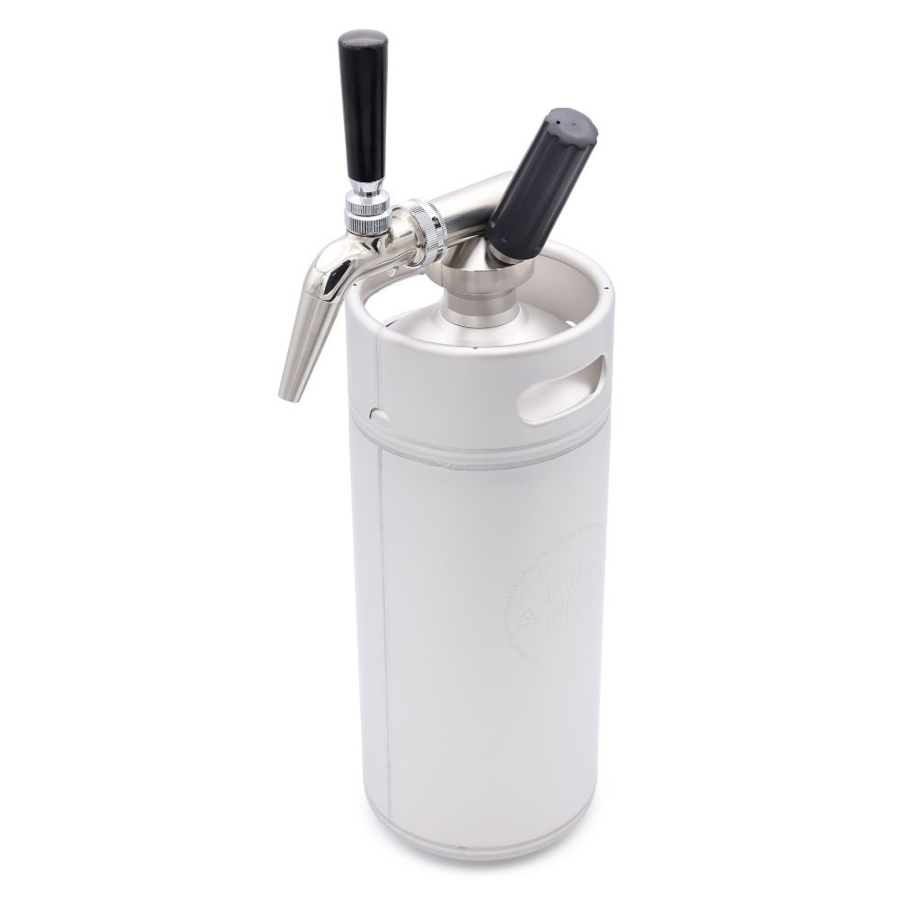 Мини-кег изготовлен из нержавеющей стали. В комплект входит нитро-головка с краном и адаптером для газовых баллончиков. Кег легко помещается в холодильник и рассчитан в среднем на 8 порций напитка в зависимости от объёма бокала и рецептуры.