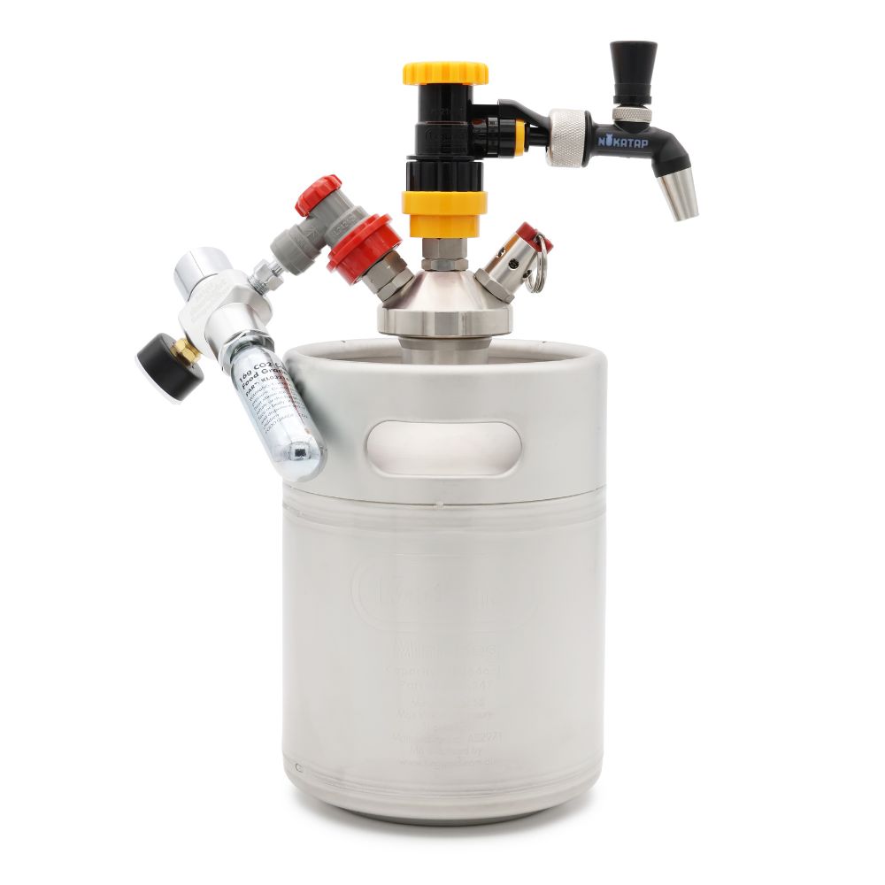 Готовый комплект оборудования с компактным краником Nukatap Mini и устройством с мини-редуктором. Включает в себя всё необходимое для розлива напитка из мини-кега в домашних условиях.